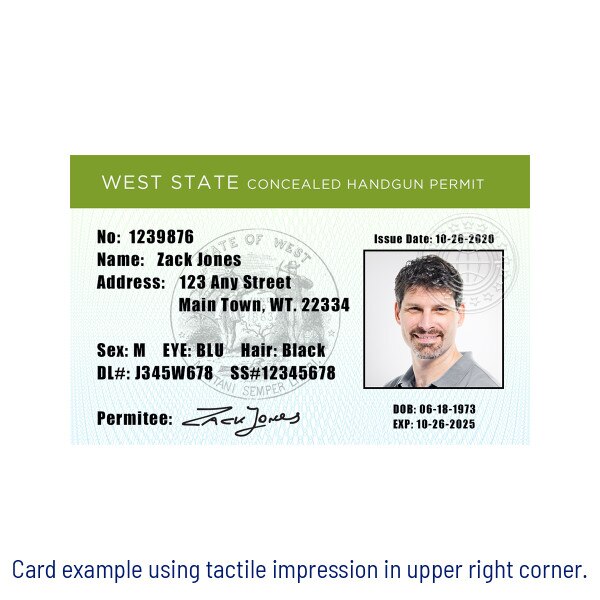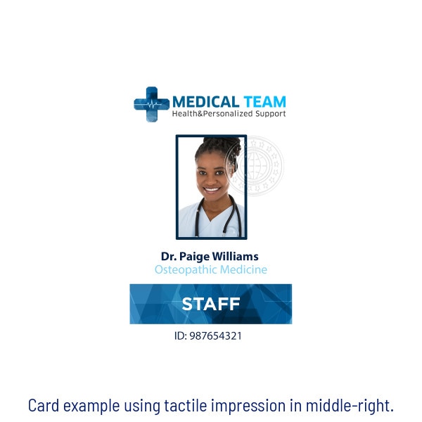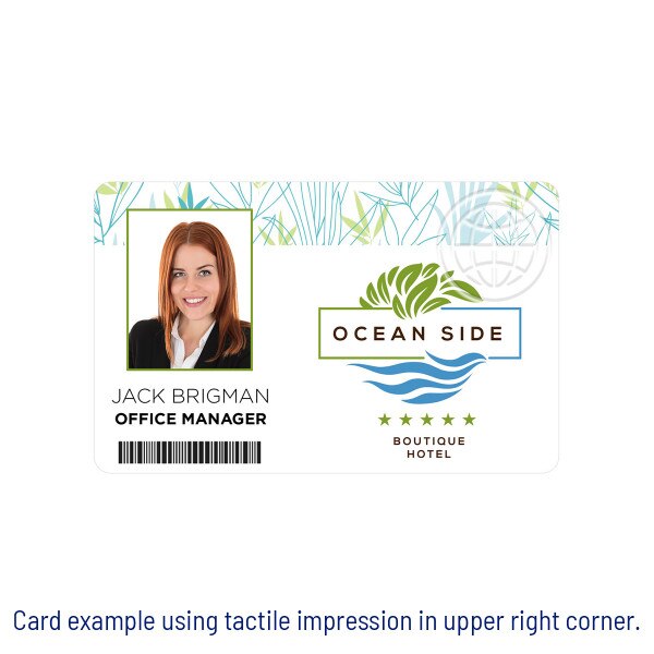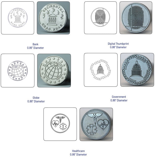 The tactile impression feature is a unique security feature used to increase the tamper resistance of a card as well as highlight and promote the customer brand. Entrust offers several different generic tactile designs that fit most market applications. These designs showcase a combination of portrait-oriented dies, landscape-oriented dies and dies that can fit either orientation. Once the die is installed in the tactile impresser module, it cannot be rotated based on card orientation. However, a more symmetrical design can fit both landscape and portrait orientations. Entrust also offers the option to create a unique, custom design specific for your ID card program. This tactile impression can contain text, logos, and outlines of images that may vary in design and complexity. After the card is printed and laminated, the tactile impressor uses residual heat to press into the laminate of the card, producing a three-dimensional raised impression. This makes your cards extremely difficult to illegally duplicate. After you place your order, a J. O'Brien representative will contact you to get details about where you would like the impression on the card, it's orientation, etc. If you order a custom die, you will also need to provide artwork. Your J. O'Brien representative will walk you through the entire process. If you have more questions before you place your order, call us at (877) 379-8844 or email customerservice@jobrien.com.