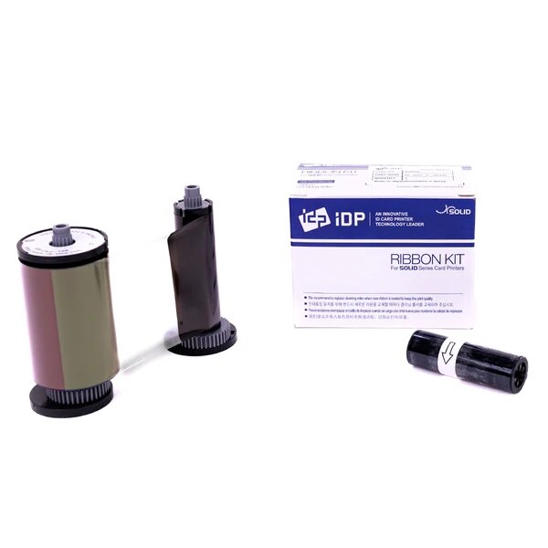 The IDP 653379-28 color ribbon has a YMCFK panel arrangement that produces 500 images per roll. The panels in this ribbon are used in combination to create full-color images and text on ID cards.